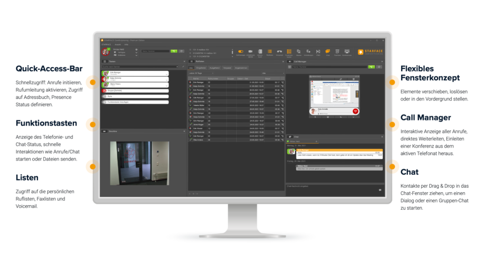 Kontakte, Anruflisten, Sprach- oder Chatnachrichten erfassen Sie auf einen Blick und bearbeiten diese so, wie Sie es von genutzten Anwendungen aus dem privaten Bereich kennen. Die STARFACE APP für Windows, macOS,  machen Ihren PC, oder Ihren Mac zur Kommunikationszentrale, egal ob im Büro, Homeoffice.